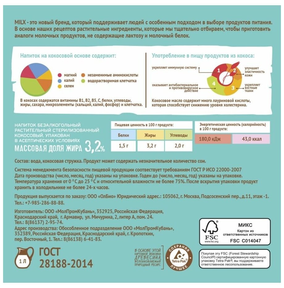 Растительное молоко Кокосовое, MILX, 1 л * 3 шт информация: