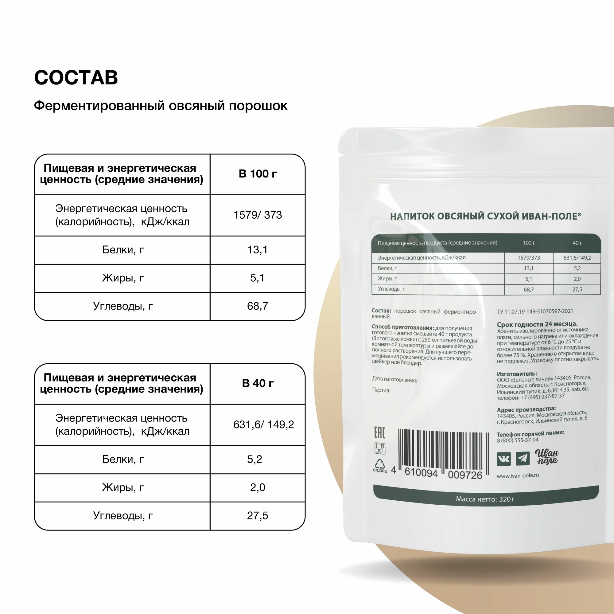 Растительное сухое Овсяное молоко, набор 2 шт, без сахара, веган, без лактозы, немолоко, Иван-поле, 640 г информация: