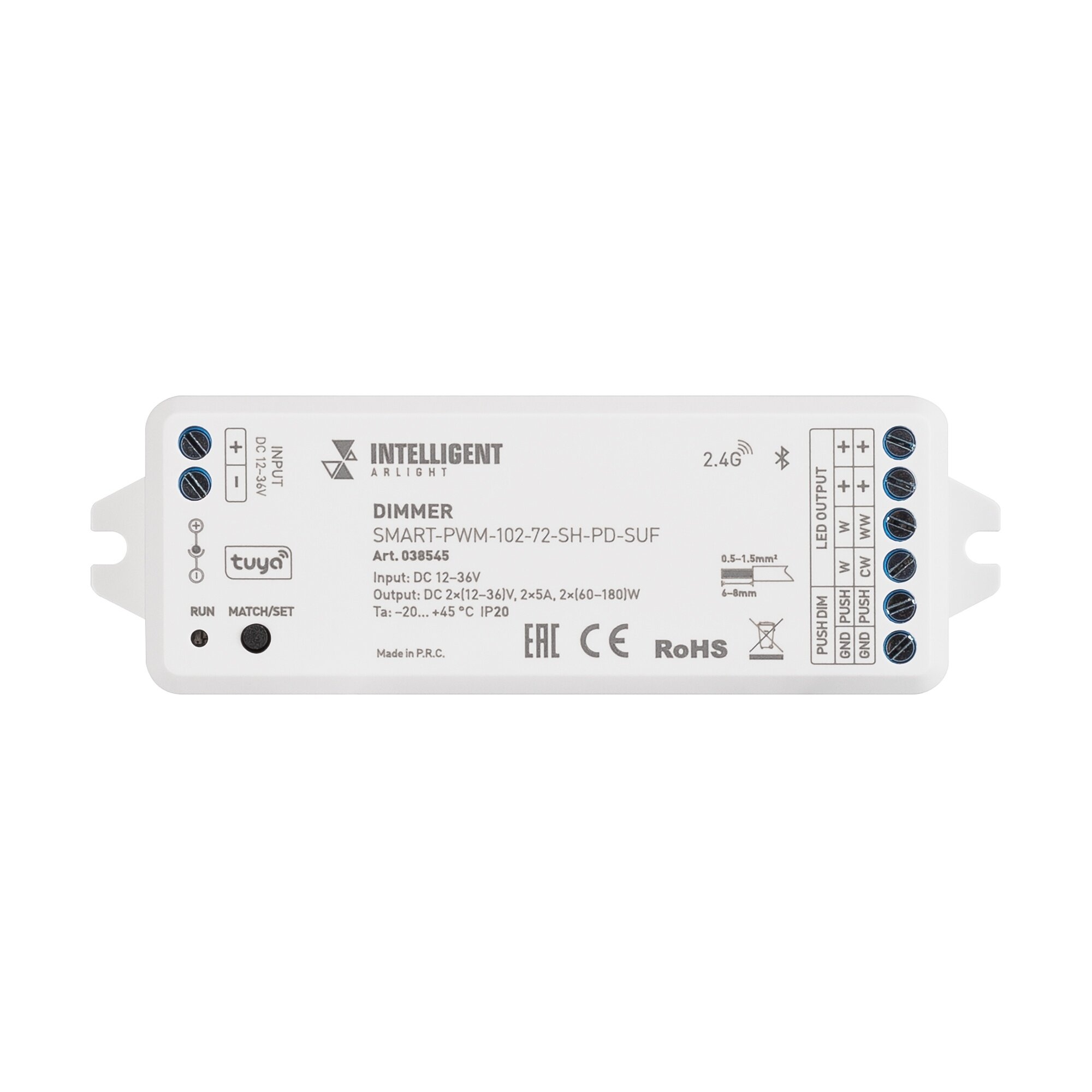 038545 INTELLIGENT ARLIGHT Диммер SMART-PWM-102-72-SH-PD-SUF (12-36V, 2x5A, TUYA BLE, 2.4G) (IARL, IP20 Пластик, 5 лет) информация: