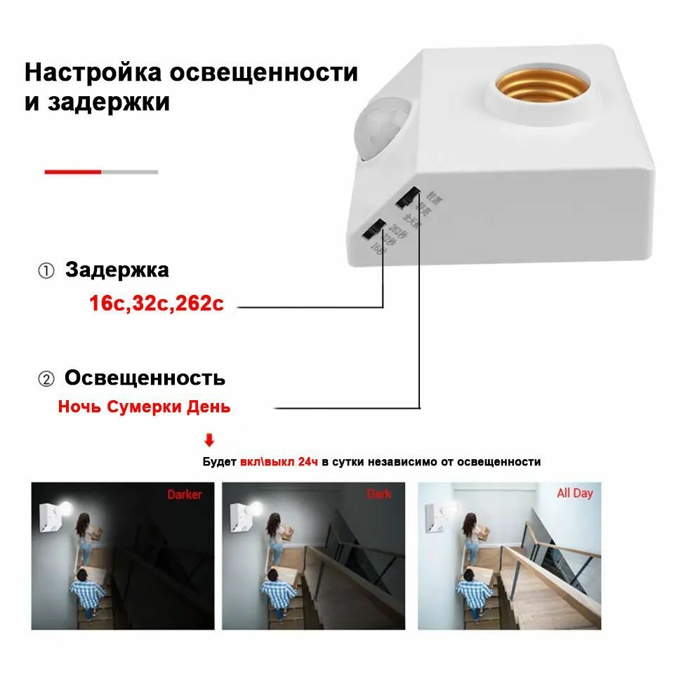 10 цен на Патрон с датчиком движения и освещенности 220В цоколь Е27
