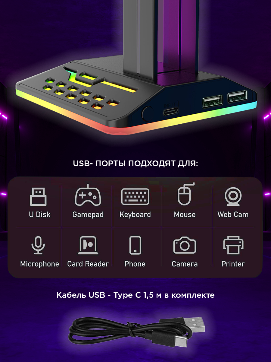 | Комплектация | Держатель для наушников и гарнитуры в разборе - 1 шт Кабель USB - Type C 1,5 м - 1 шт |