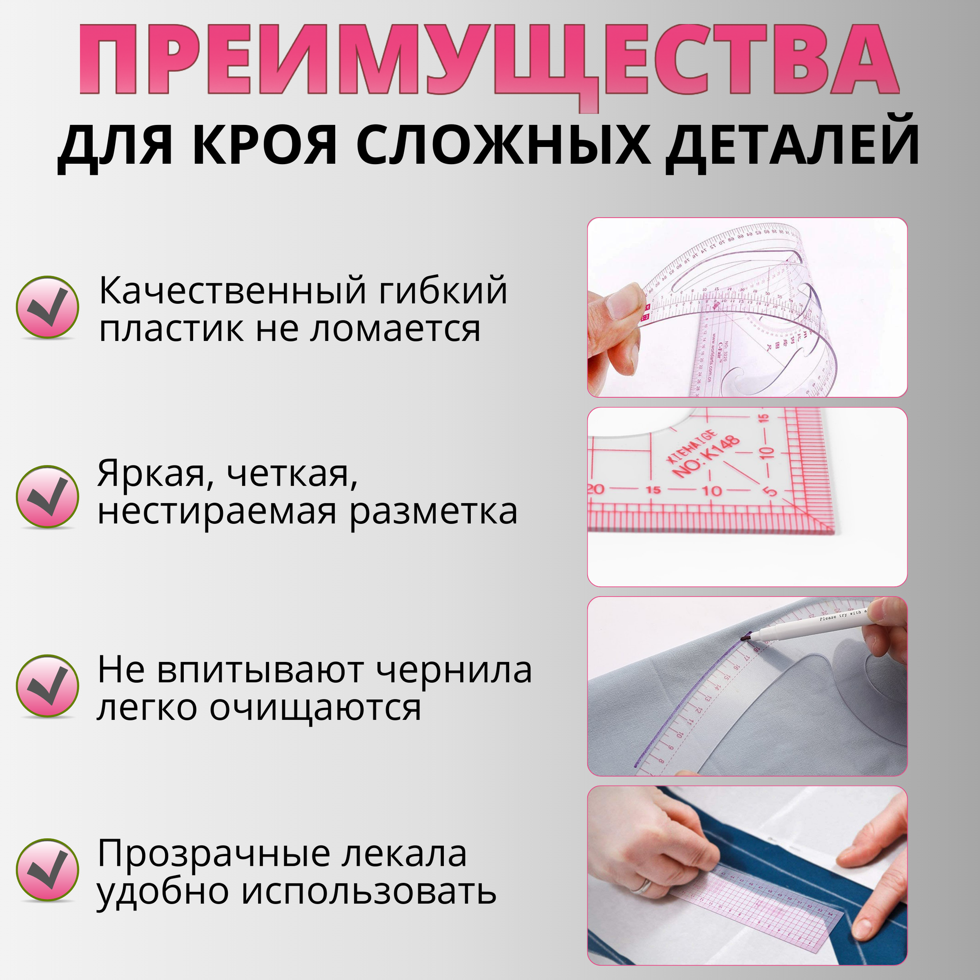 | Дополнительная информация | Лекало закройщика удобно в работе не впитывает грязь и легко очищается от мела, мыла и портновских чернил. Лекало для шитья изготовлено из гибкого прочного пластика. Лекало для черчения максимально функциональный, в нем отсутствуют повторяющиеся линии и дублирование функционала. |