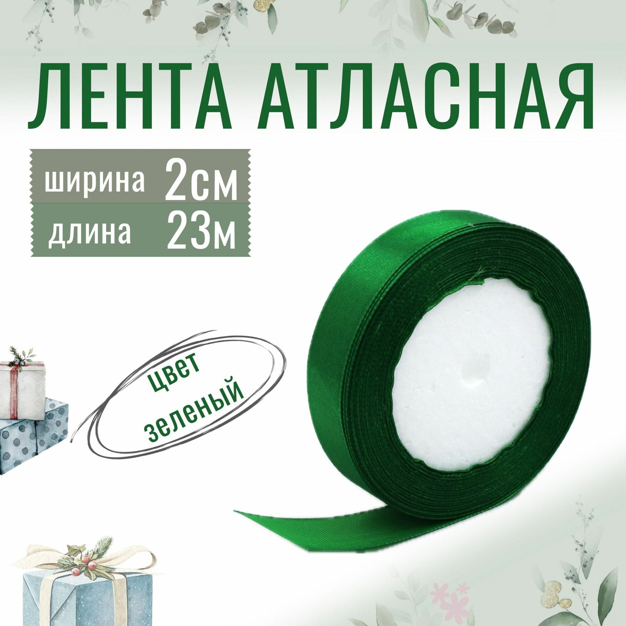 Лента атласная 2см х 23м зелёная, упаковочная для рукоделия, для декора и творчества, шитья, упаковки и оформления подарков, 20мм информация: