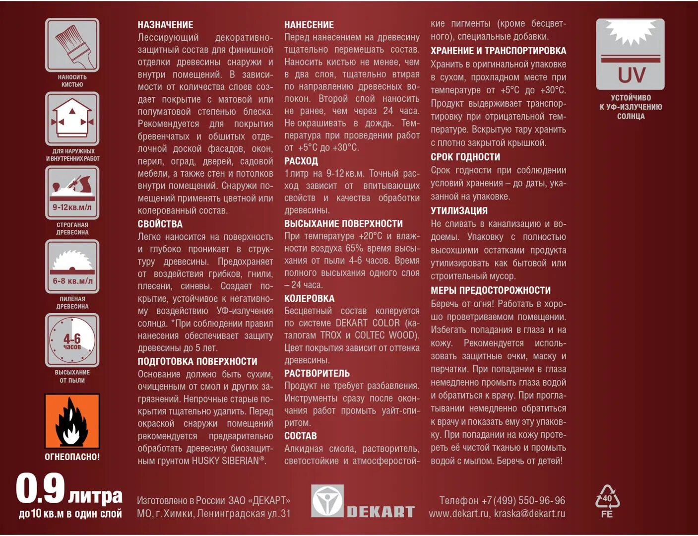 | Особенности | УФ-защита, без запаха, водозащитная, декоративная, морозостойкая, с антисептиком |