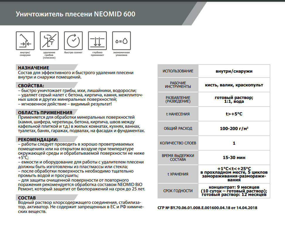 Уничтожитель плесени Neomid 600 концентрат 1:1 (10кг) информация: