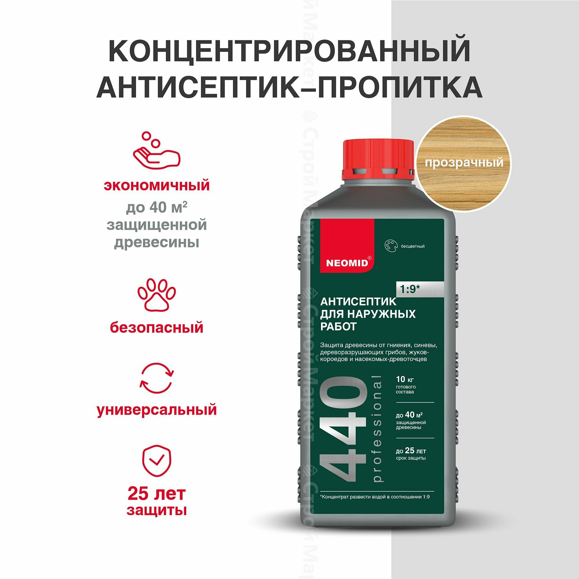 Антисептик для дерева Neomid 440 Бесцветный (1 кг) / Деревозащитный состав для наружных работ и внутренних работ/ От плесени, мха, водорослей и насекомых