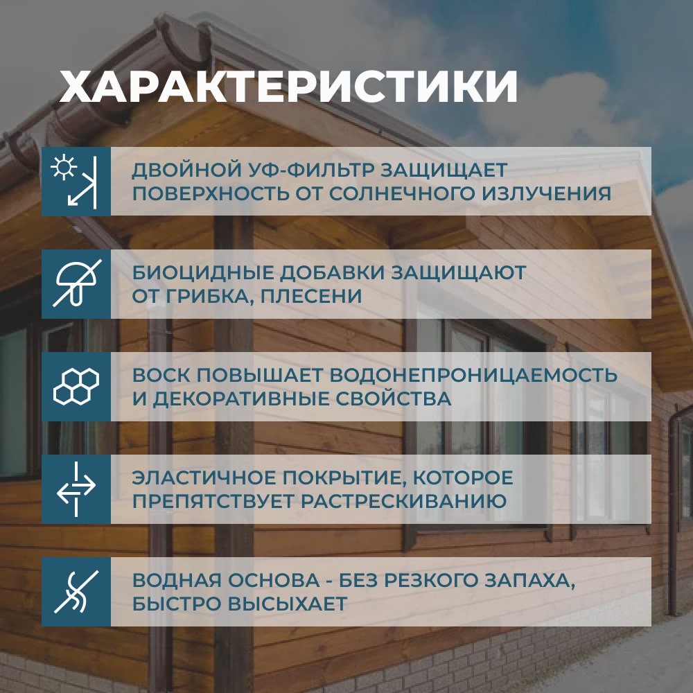 | Особенности | УФ-защита, без запаха, быстросохнущая, водозащитная, декоративная, с антисептиком |