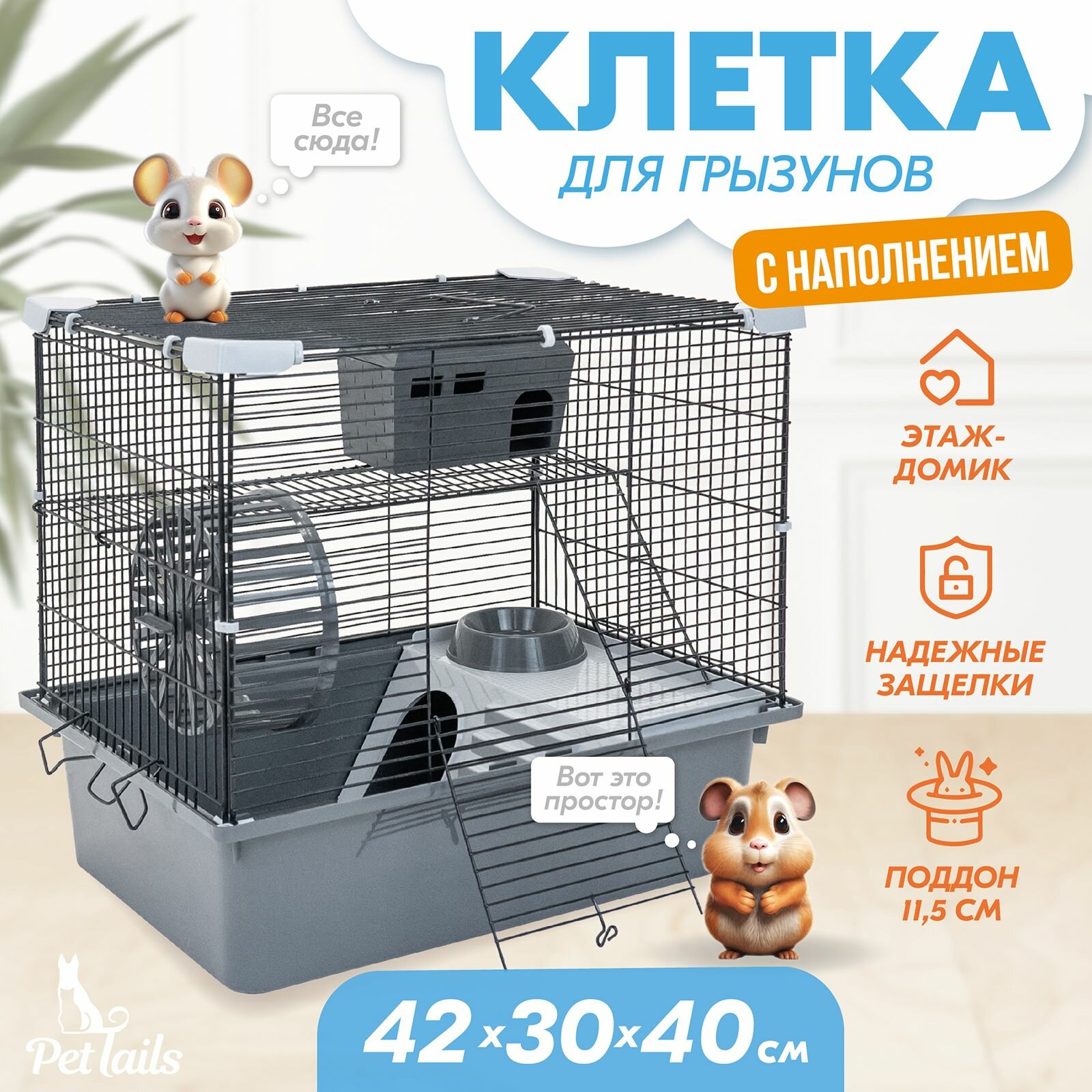 Отзывы на Клетка для грызунов "PetTails" разборная, шаг прута 10,5мм, 42*30*h40см, 1 этаж (+полка-домик, колесо, миска, пласт. домик) серая