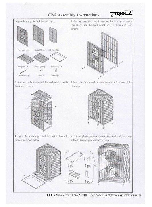 | Подробная комплектация | - поилка объёмом 250 мл; - миска; - 3 полки; - 3 лесенки; - выдвижная решетка; - пластиковый поддон; - колеса. |