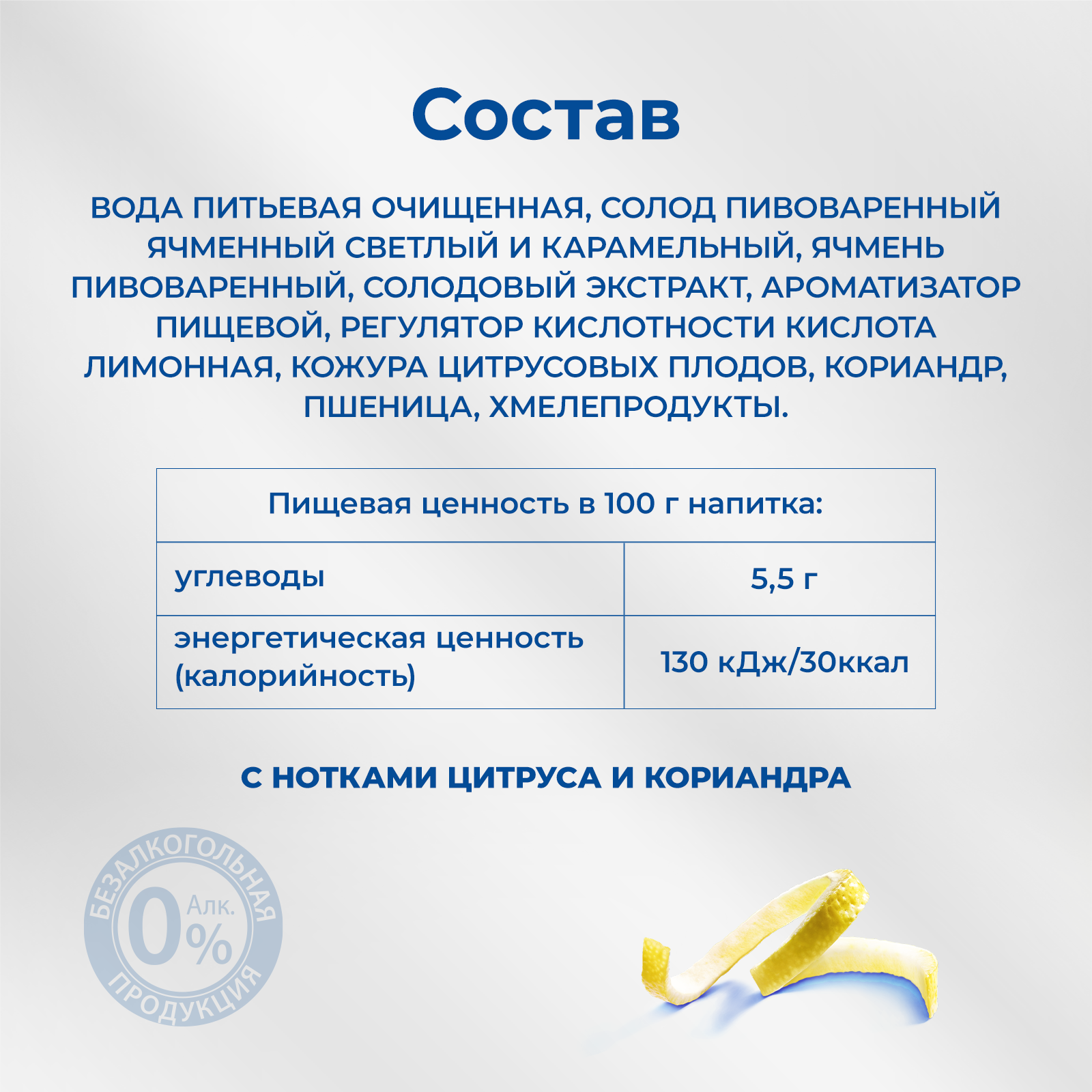 | Состав | вода питьевая очищенная, солод пивоваренный ячменный светлый и карамельный, ячмень пивоваренный, солодовый экстракт, ароматизатор пищевой, регулятор кислотности кислота лимонная, кожура цитрусовых плодов, кориандр, пшеница, хмелепродукты |