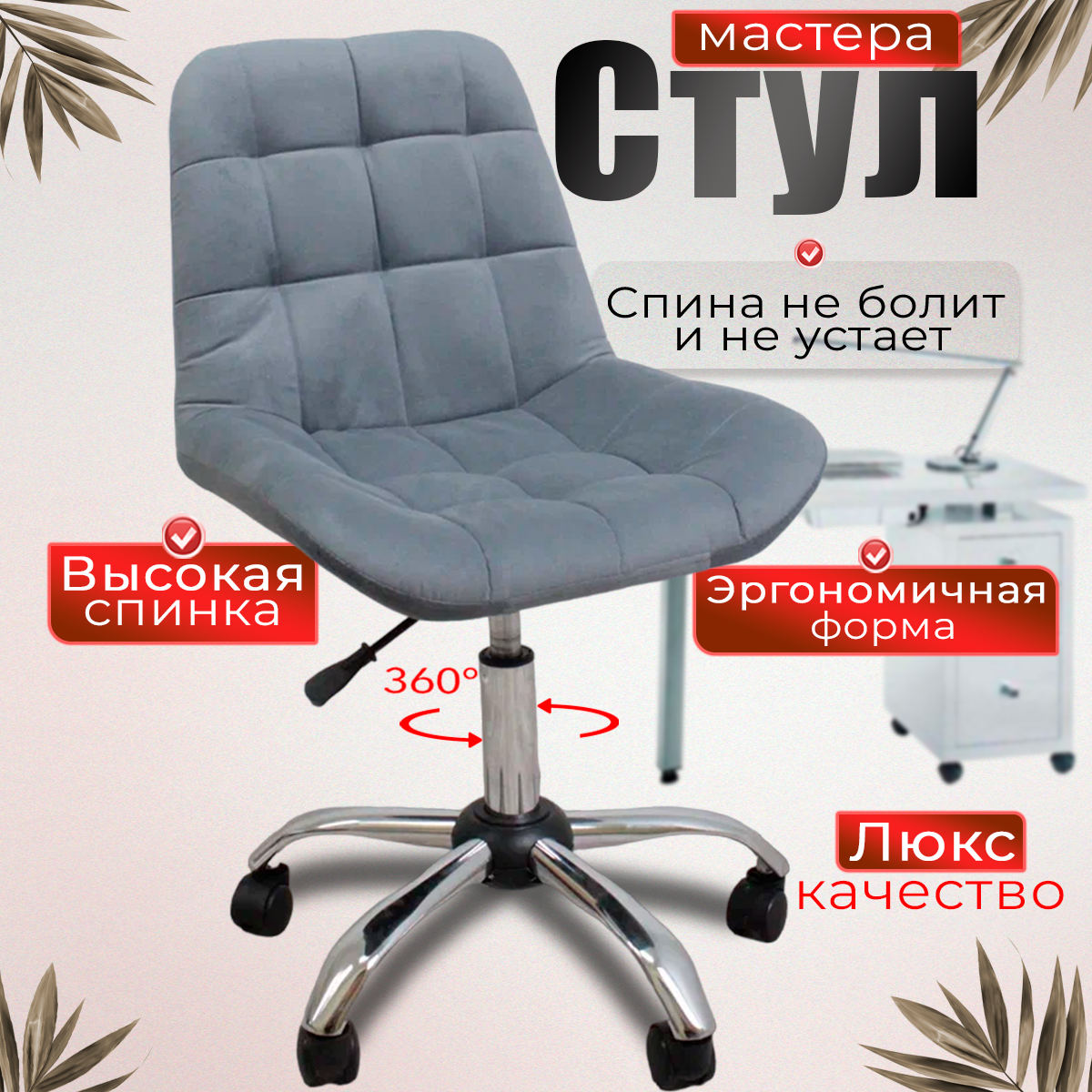 10 цен на Стул для мастера на колесиках, серый велюр