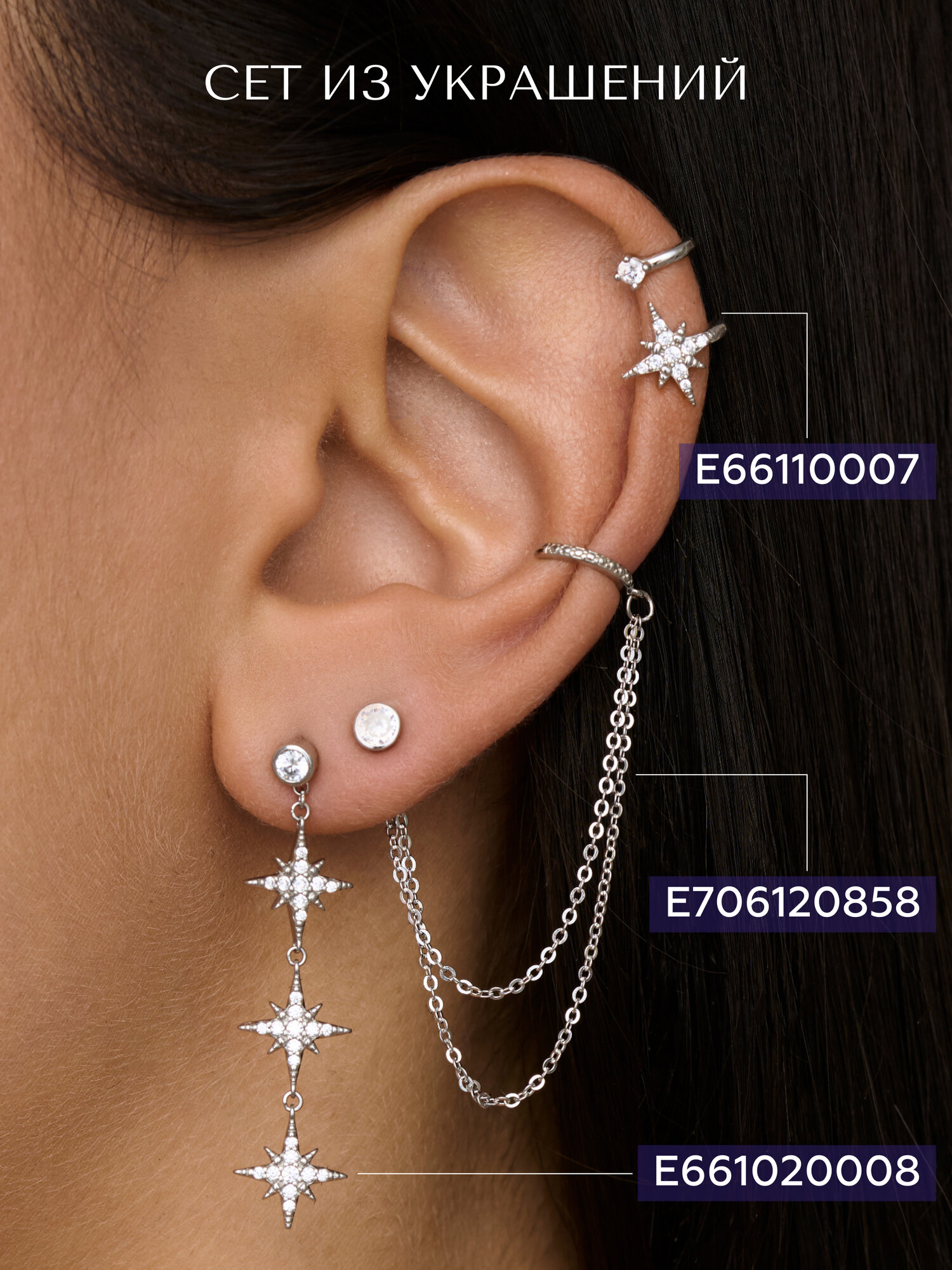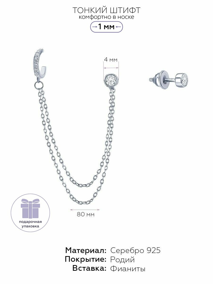 Моносерьга MIESTILO серебро 925, одиночная серьга кафф с цепочкой 2 695 ₽