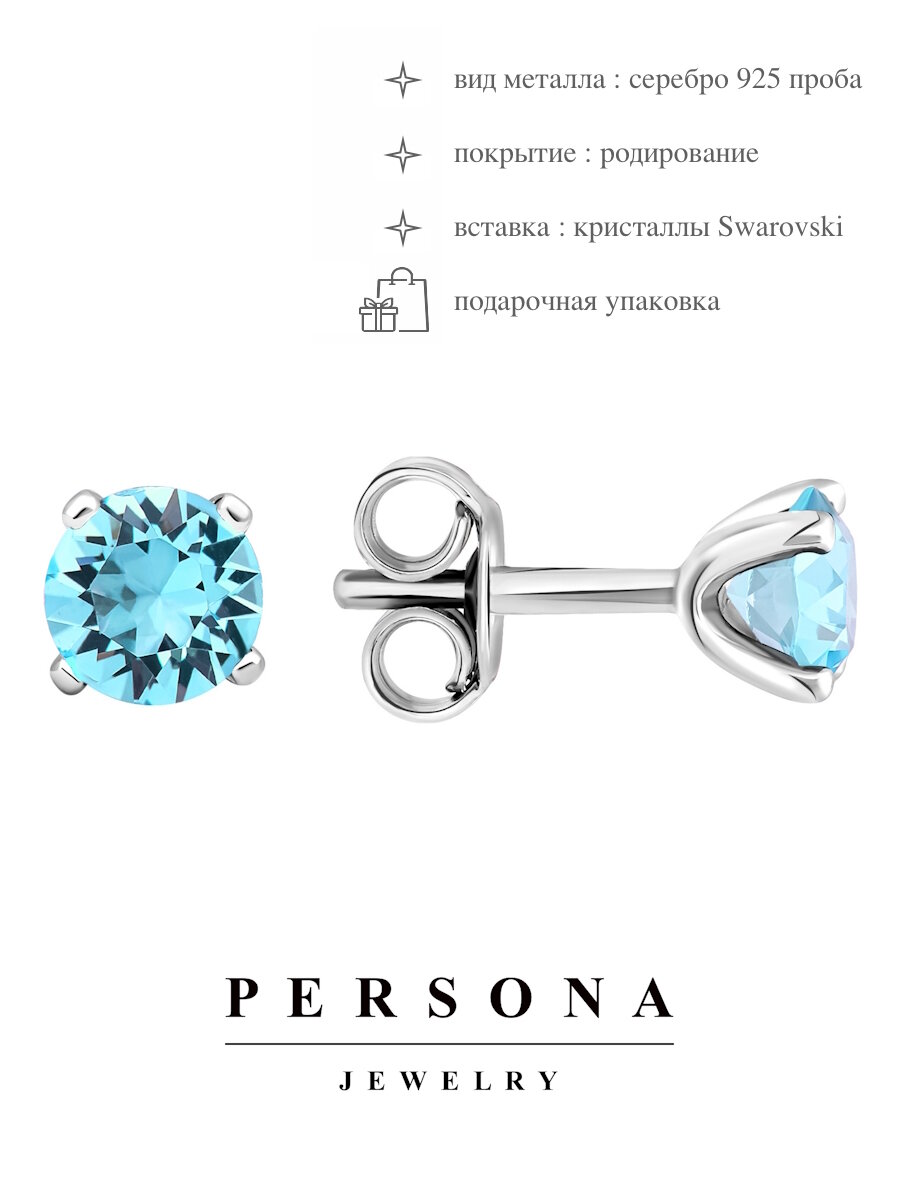 Серьги пусеты ПЕРСОНА, серебро, 925 проба, родирование, кристаллы Swarovski, размер 5 мм, длина 1.3 см, , бесцветный 1 790 ₽