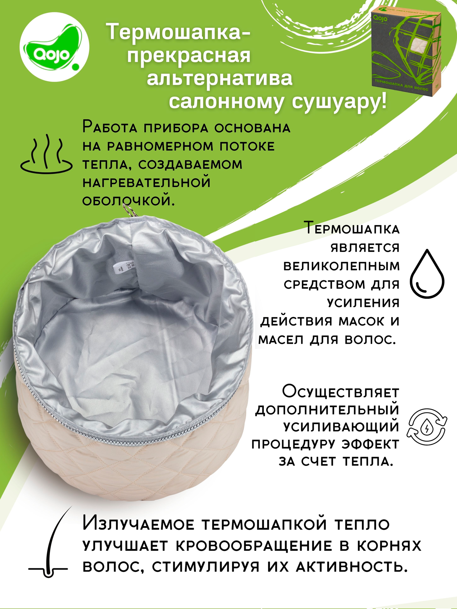 | Дополнительная информация | профессиональный уход за волосами, термошапка для масок, термошапочка для волос для масок |