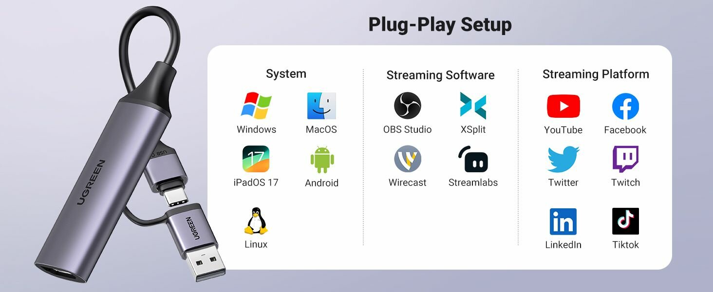 | Совместимость | Windows8.1/10/11/macOS/Linux/Android 5.0 или более поздняя версия Совместимое программное обеспечение: OBS Studio/XSplit/Potplayer/QuickTime Player и др. |
