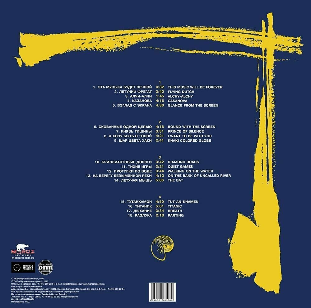 | Треклист | Side 1 : Эта музыка будет вечной - Летучий фрегат - Алчи-Алчи - Казанова - Взгляд с экрана - Side 2 : Скованные одной цепью - Князь тишины - Я хочу быть с тобой - Шар цвета хаки - Side 3 : Бриллиантовые дороги - Тихие игры - Прогулки по воде - На берегу безымянной реки - Side 4 : Тутанхамон - Титаник - Дыхание - Разлука - |