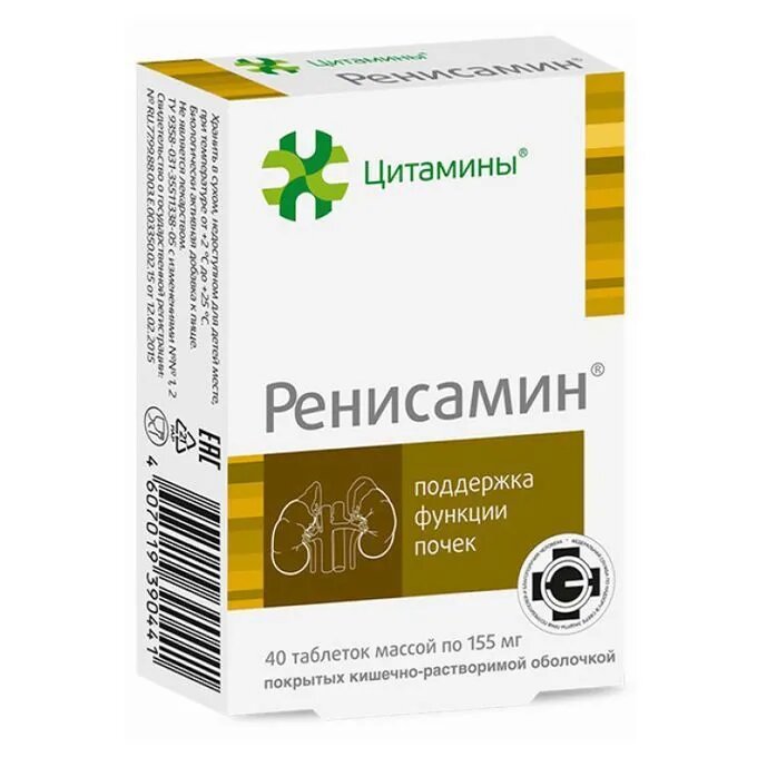 | Состав | 1 таблетка, покрытая оболочкой, содержит: Ренисамин порошок (комплекс полипептидов и нуклеиновых кислот, полученный из почек крупного рогатого скота) - 10 мг, Сахароза (лактоза), Крахмал картофельный, Стеарат кальция, Метилцеллюлоза, Кишечно-растворимое покрытие. |