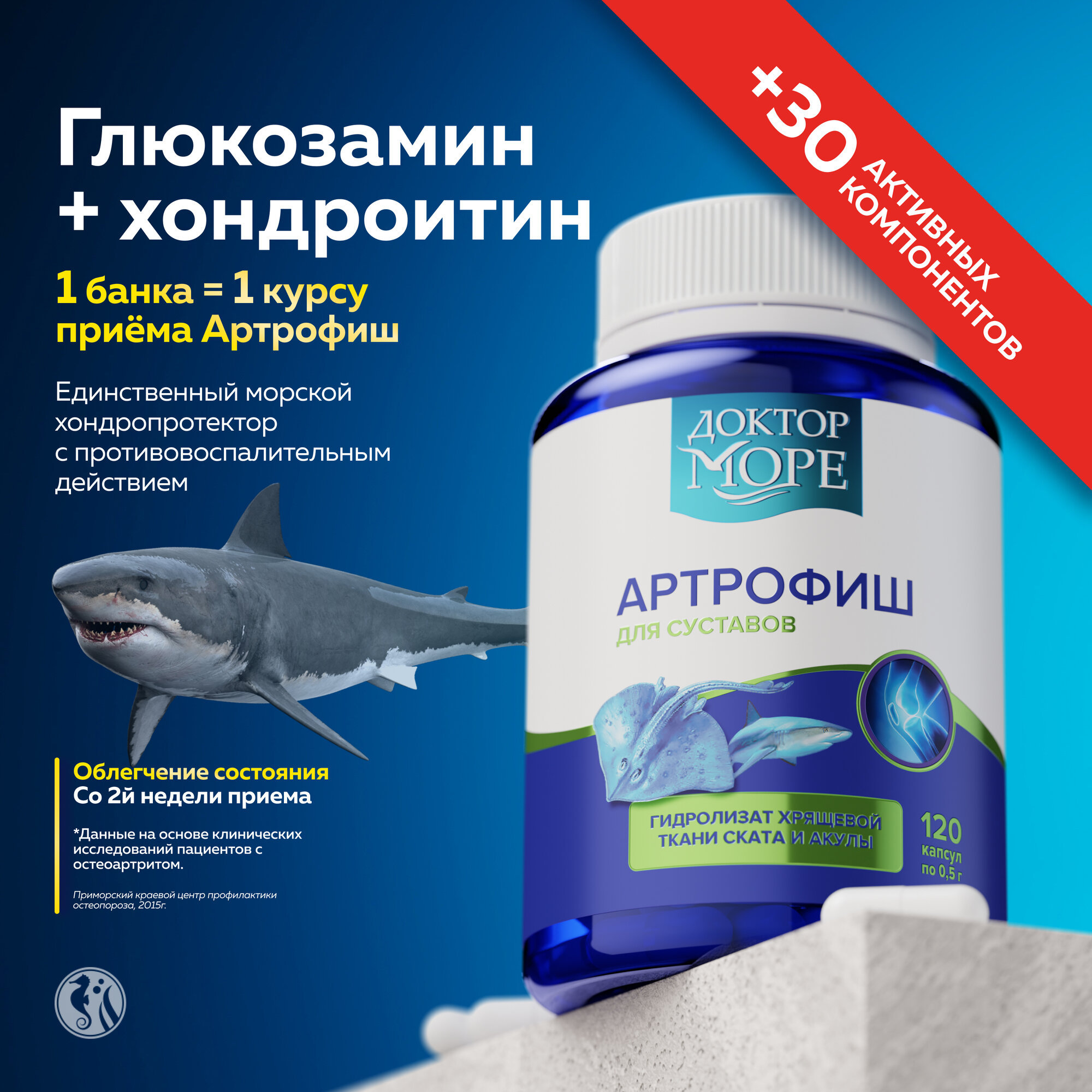 | Дополнительная информация | Хрящи акул содержат до 5 видов хондроитинов с разной молекулярной массой, что позволяет покрыть потребность в ключевых строительных компонентах хрящевой ткани, синтез которых с возрастом снижается. Эффективность хондроитина в лечении заболеваний суставов подтверждена Европейским Альянсом Ревматологов. Прием хондроитина позволяет снизить частоту приема НПВС в 2-3 раза. Хондроитин морского происхождения обладает высоким индексом биодоступности и не оказывает негативного воздействия на ЖКТ даже при длительном приеме, в отличие от других хондропротекторов. |