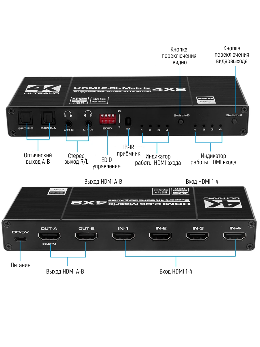 Матричный коммутатор (сплиттер свитчер) HDMI 4 входа 2 выхода 4K 60 Гц с двумя оптическими выходами Toslink (S/PDIF) и 3,5 jack информация: