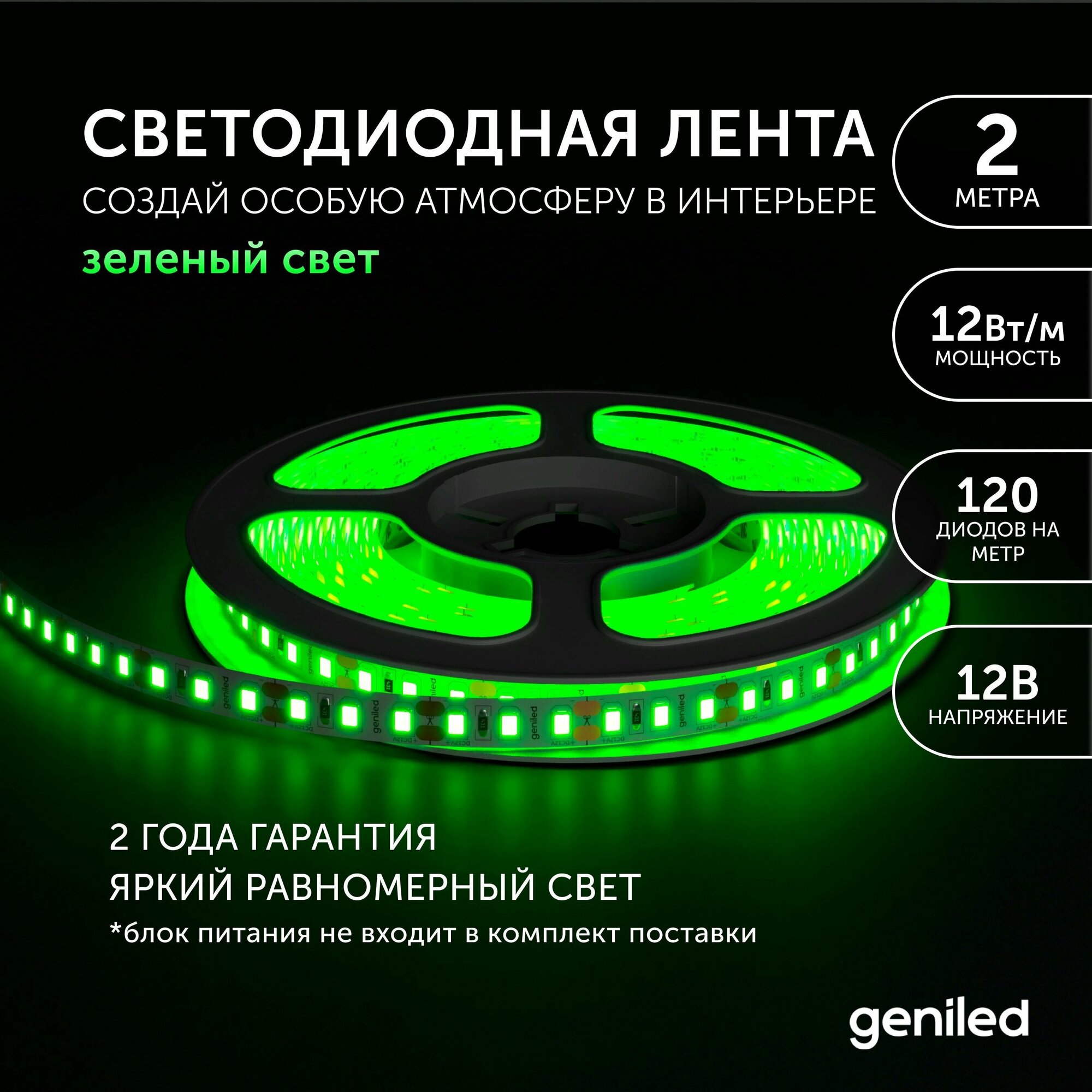 Светодиодная лента, подсветка Geniled - для комнаты, в гардероб, на кухню - Зеленый свет / GL-120SMD2835 / 12В / Длина - 2м / B - 8 мм / W - 12Вт / Green / IP33 информация: