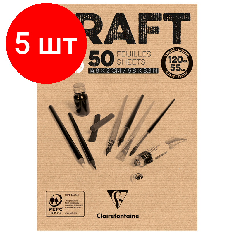 Комплект 5 шт, Скетчбук - блокнот 50л., А5 Clairefontaine "Kraft", на склейке, верже, крафт, 120г/м2 информация: