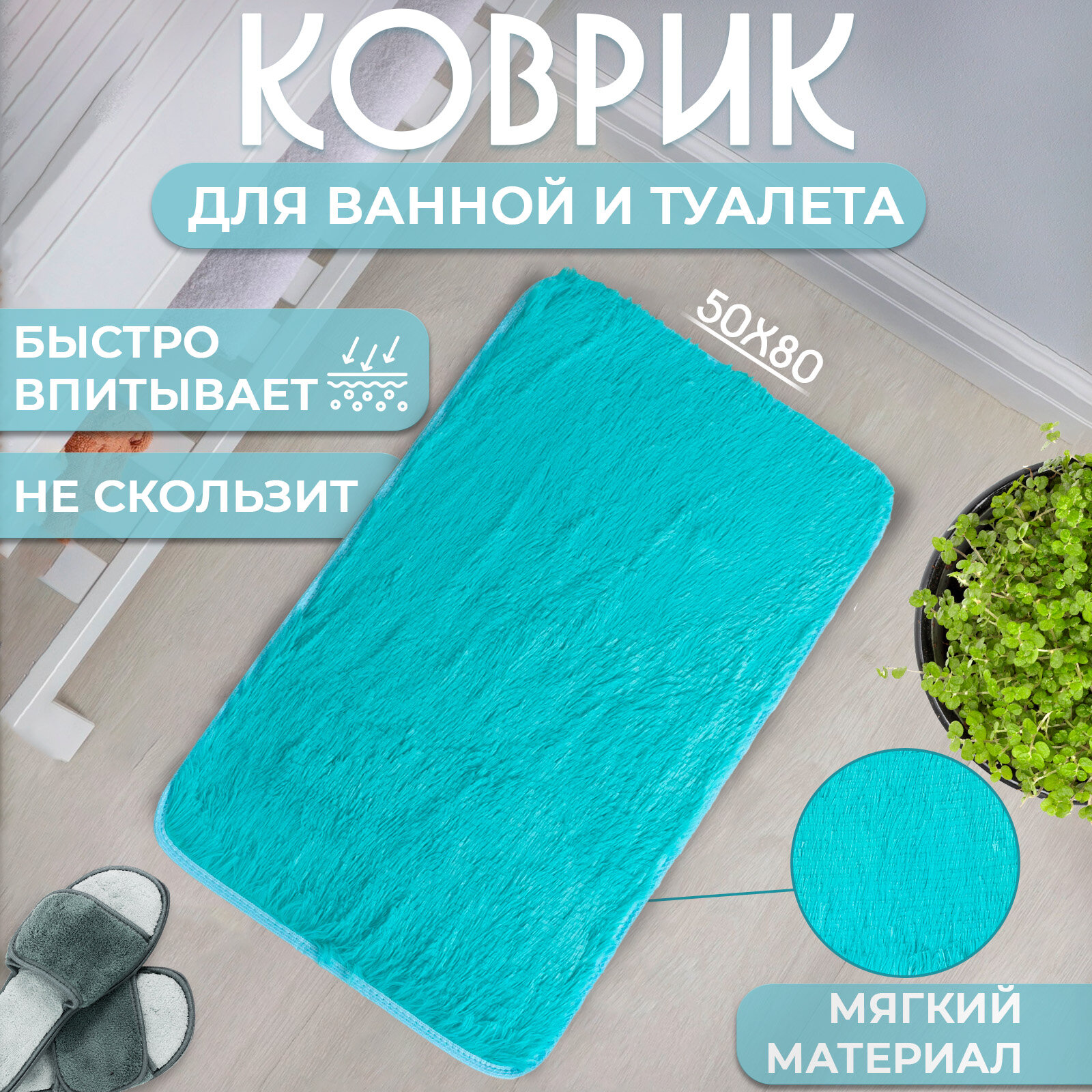 Коврик для дома прямоугольный "Пушистик", 50x80 см, цвет лазурный 1 007 ₽