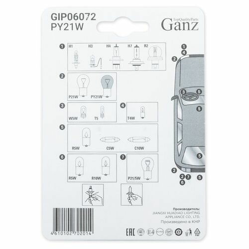 GANZ GIP06072 Лампа 12V PY21W 21W BAU15s GANZ 2 шт. блистер GIP06072
