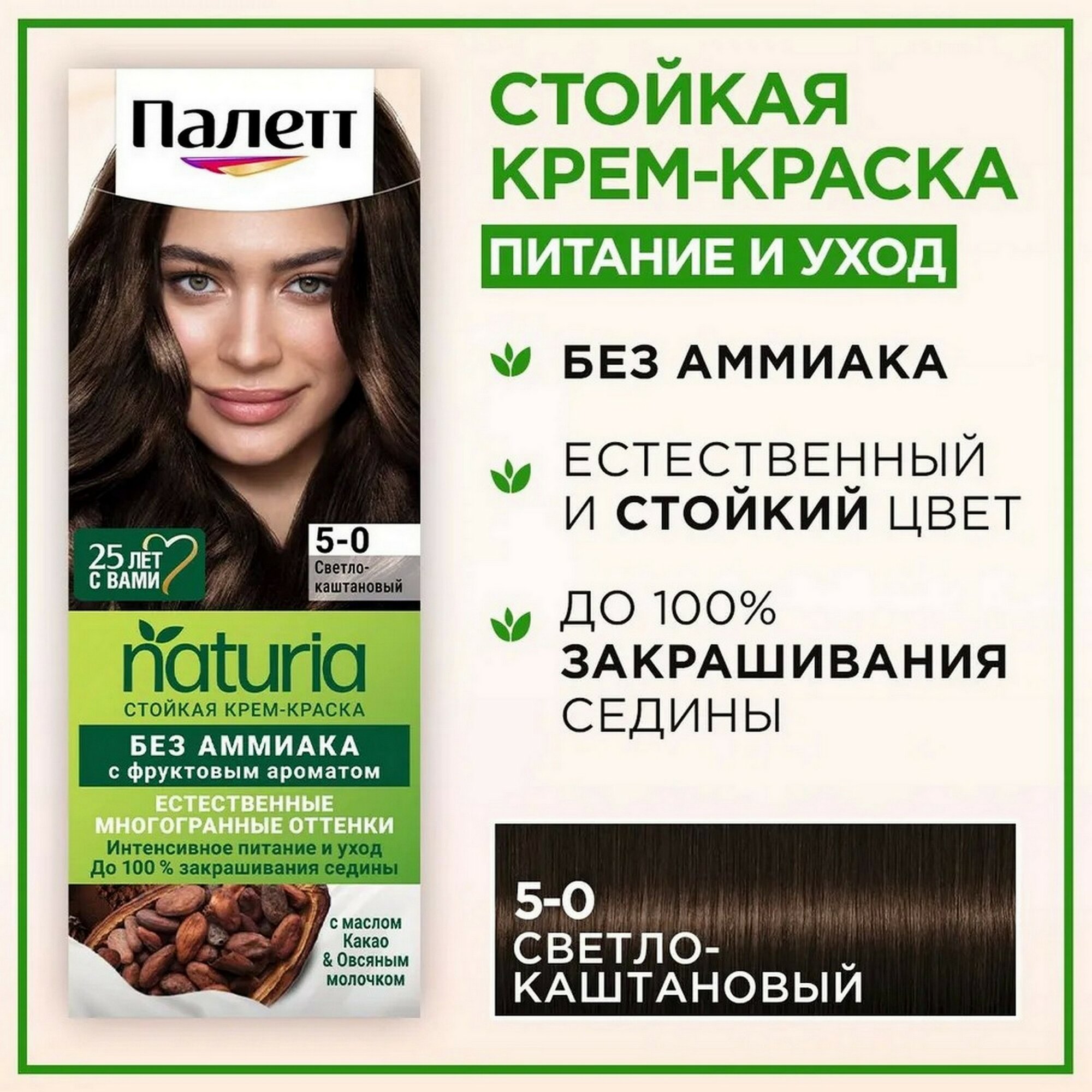 Палетт Naturia Стойкая крем-краска для волос, 5-0 светло-каштановая, 110 мл - 1 шт 408 ₽
