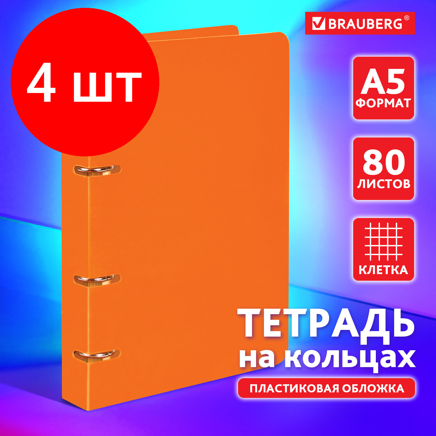 Тетрадь на кольцах А5 160х215 мм, 80 л.,пластик, клетка, BRAUBERG, "Оранжевый", 4 шт.