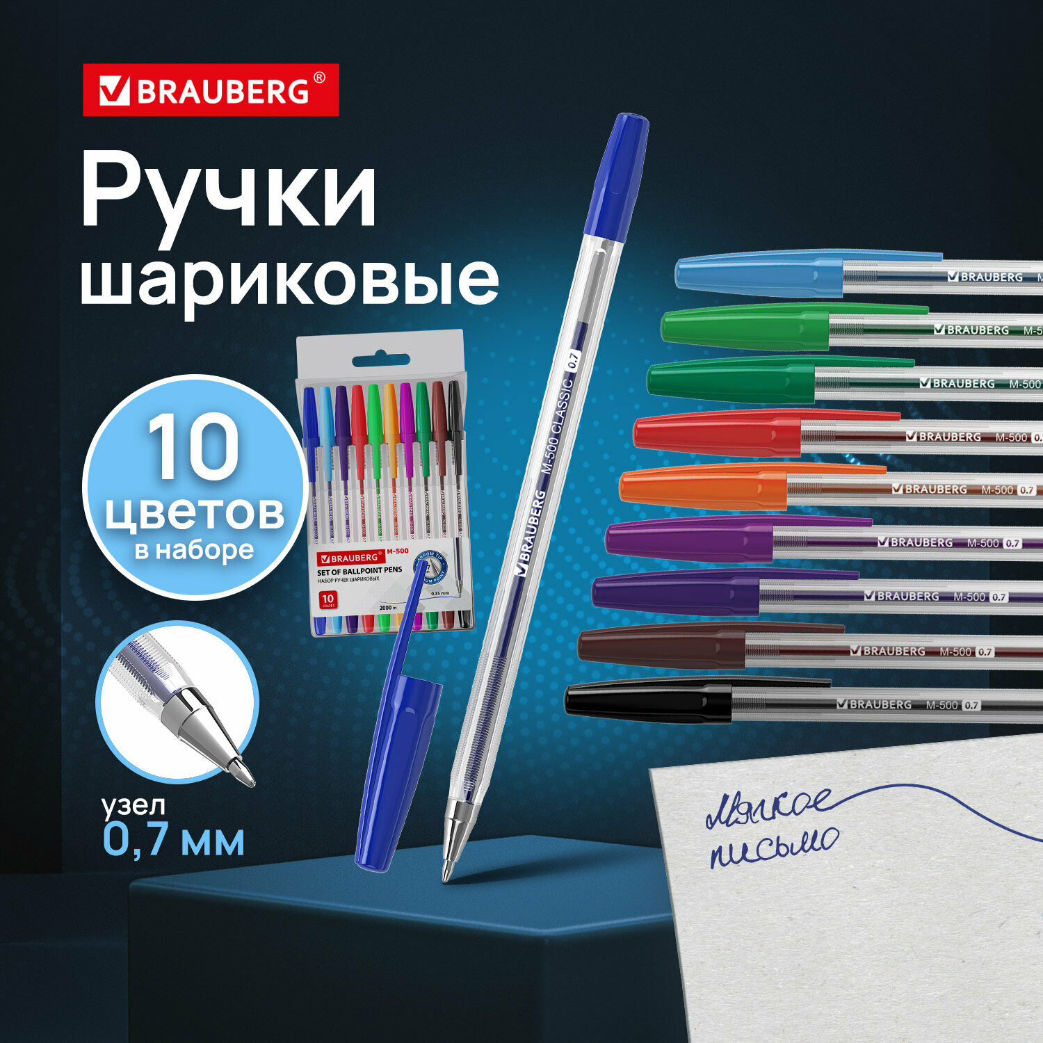 Ручки шариковые BRAUBERG "M-500", набор 10 цветов, ассорти, узел 0,7 мм, линия письма 0,35 мм, 143455 - 1 шт.