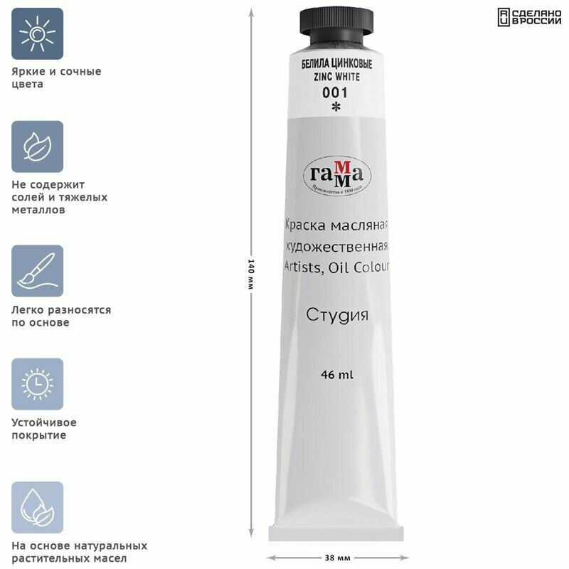 Краска масляная художественная Гамма "Студия", 46мл, туба, белила цинковые 213 ₽