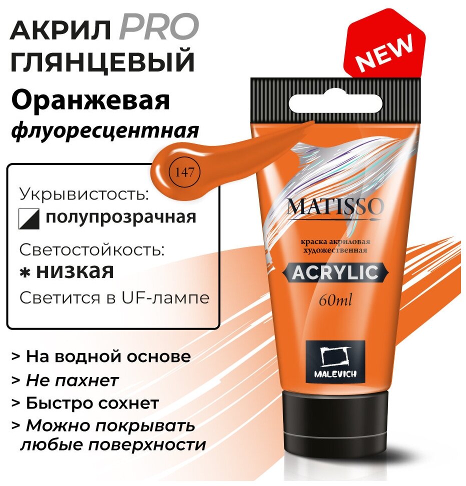 Акриловая краска Малевичъ Matisso, оранжевая флуоресцентная, 60 мл информация: