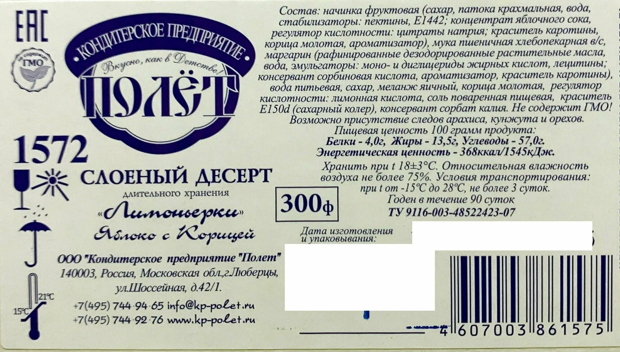 | Состав | начинка фруктовая (сахар, патока крахмальная, вода, стабилизаторы: пектины, Е1442; концентрат яблочного сока, регулятор кислотности: цитраты натрия; краситель каротины, корица молотая, ароматизатор), мука пшеничная хлебопекарная в/с, маргарин (рафинированные дезодорированные растительные масла, вода, эмульгаторы: моно- и диглицериды жирных кислот, лецитины; консервант сорбиновая кислота, ароматизатор, краситель каротины), вода питьевая, сахар, меланж яичный, корица молотая, регулятор кислотности: лимонная кислота, соль пищевая, краситель Е150d (сахарный колер), консервант сорбат калия |