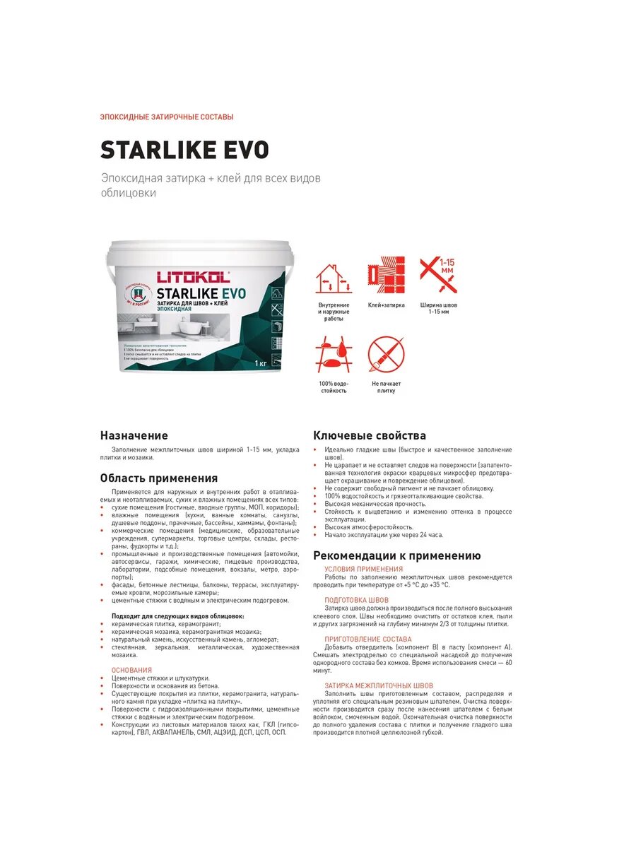 | Дополнительная информация | средний расход при использовании в качестве клея - 1,45 кг/м² на каждый 1 мм толщины слоя; устойчивость затёртых швов к резким перепадам температур, от -20 °С до +100 °С; время открытого слоя: 20 минут; время корректировки: 60 минут |