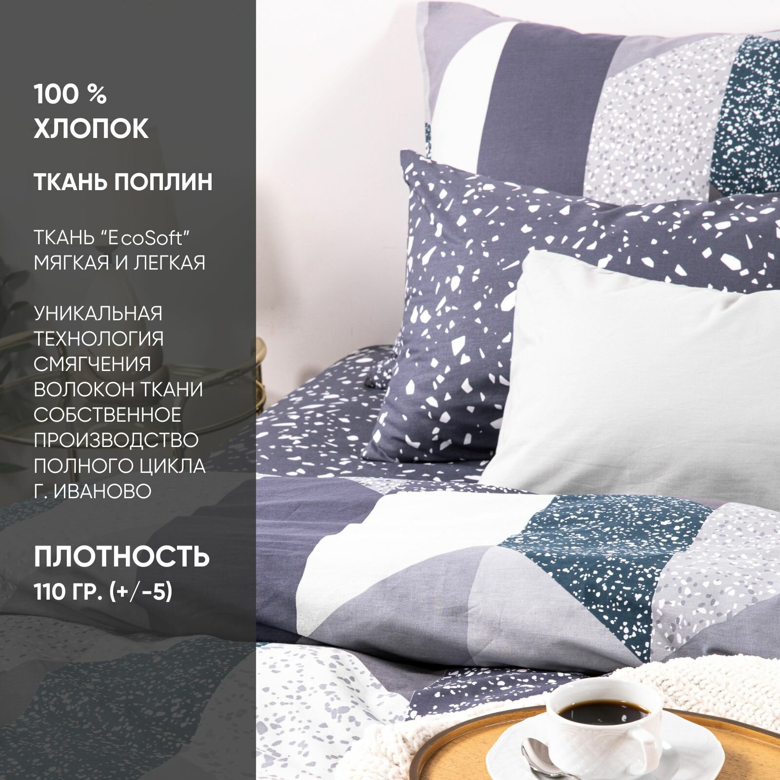 Постельное бельё Евро Ночь Нежна Флорида 200х215 см, 240х215 см, 70х70 см 2шт, поплин, 110гр, хл 100%, цвет серый