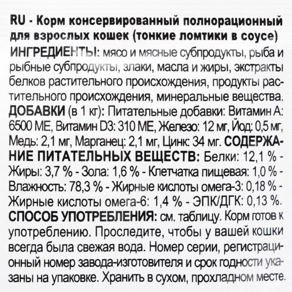 | Состав | мясо и мясные субпродукты, злаки, субпродукты растительного происхождения, минеральные вещества, экстракты белков растительного происхождения, углеводы |