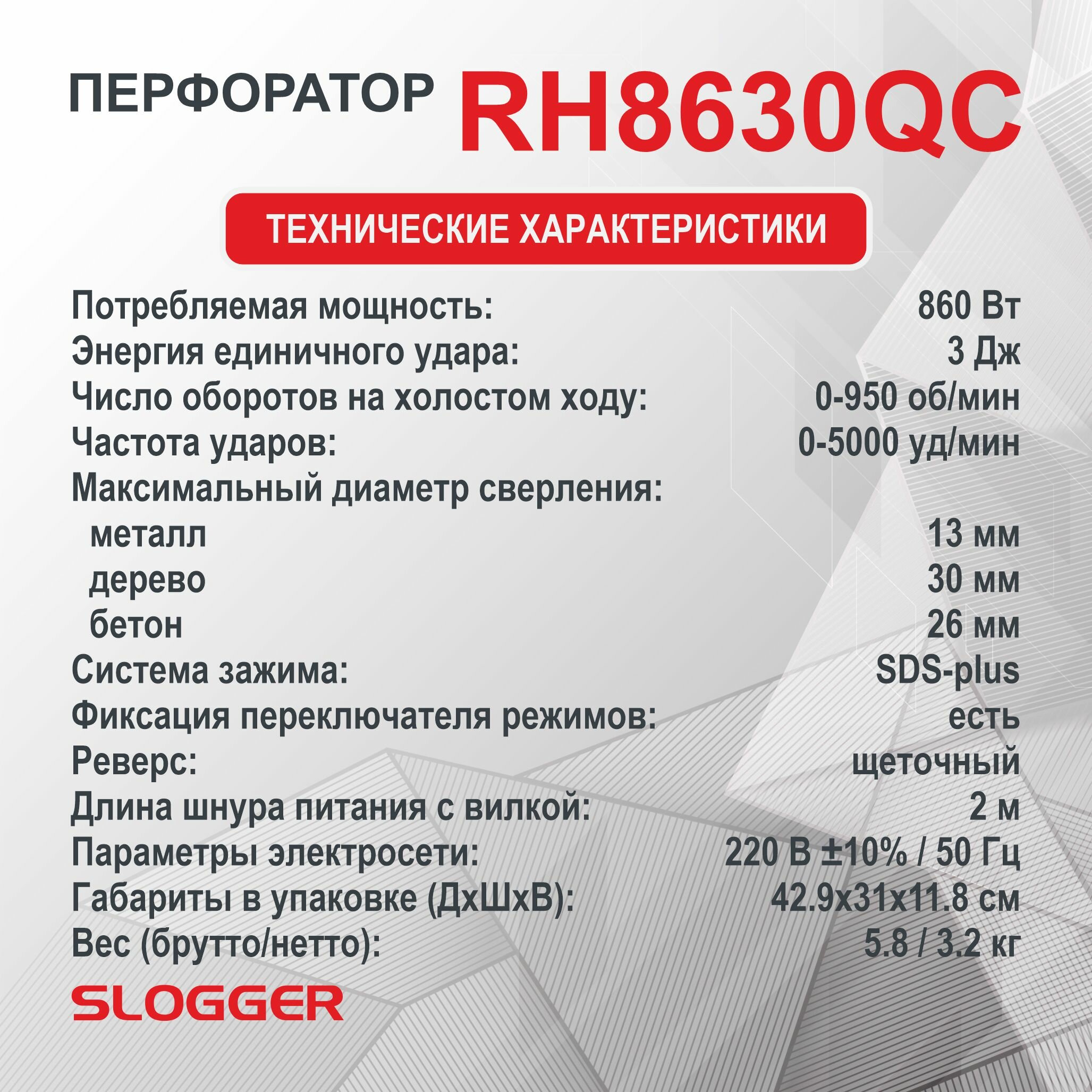 Перфоратор SDS-Plus Slogger RH8630QC, 860Вт, 3Дж, кейс, буры в комплекте информация:
