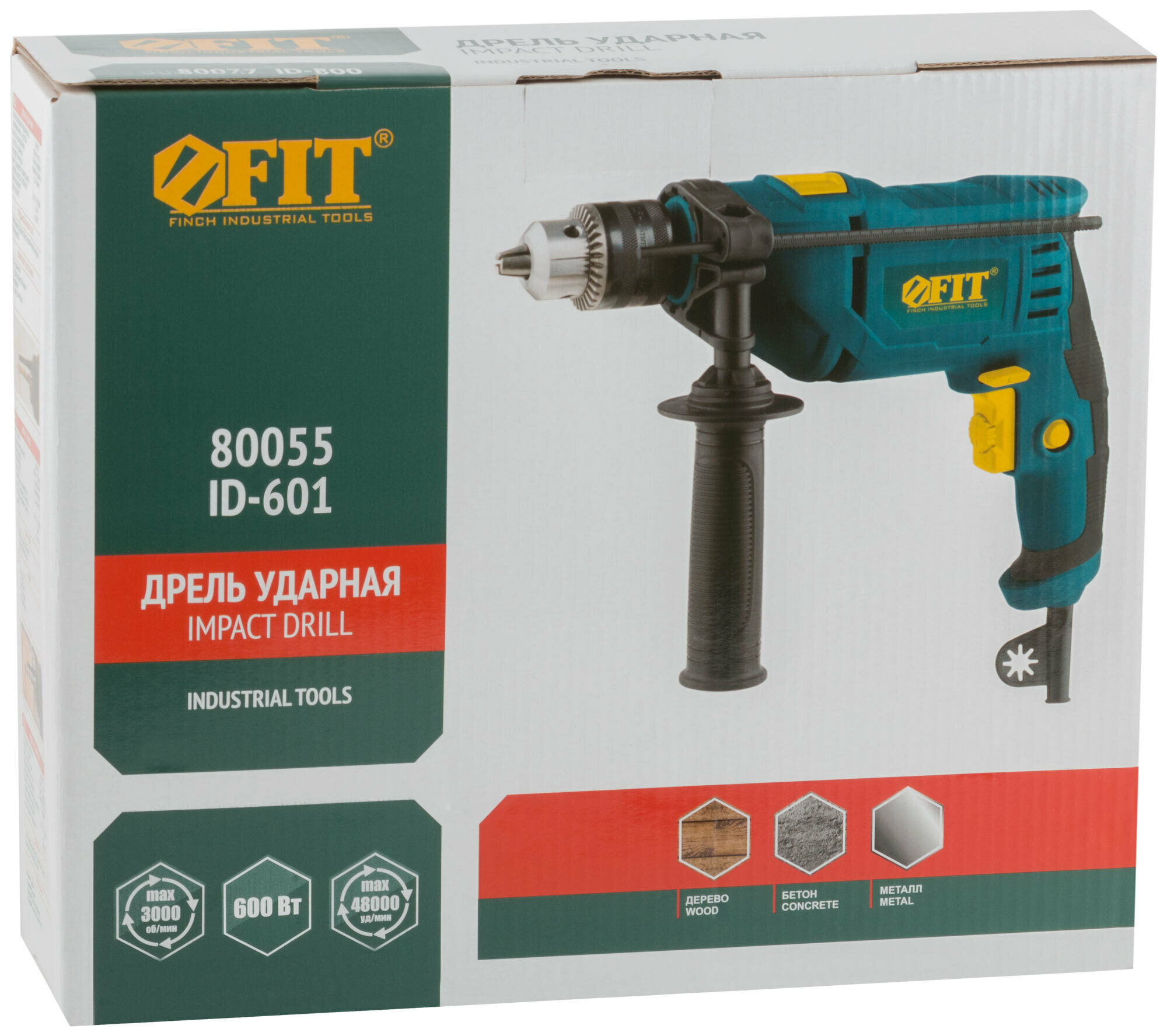 FIT Дрель ударная 600 Вт, 0-3000 об/мин, КлП 13мм, рез. накл., коробка 80055