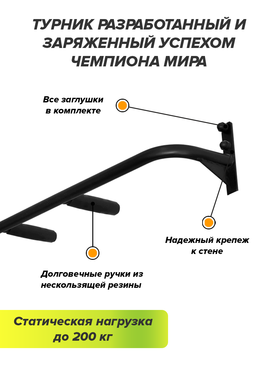 | Дополнительная информация | комплектация: турник-1шт, дюбель 12х71-4шт, шуруп 8х80-4шт; ручка турника-2шт, заглушка круглая D25-2шт, заглушка декоративная-4шт; статическая нагрузка 200 кг |