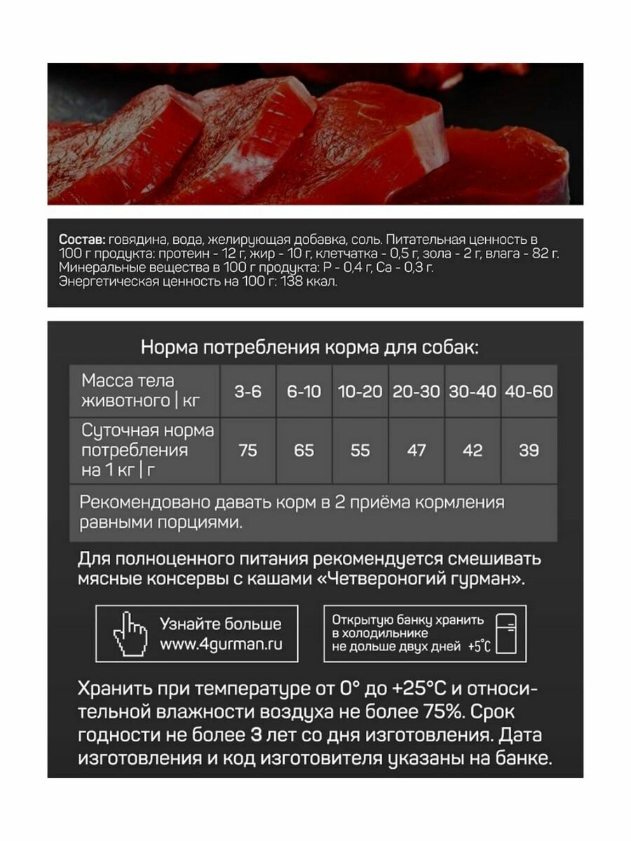 Корм влажный Четвероногий гурман Голд для собак Говядина в желе консервы 340 г информация: