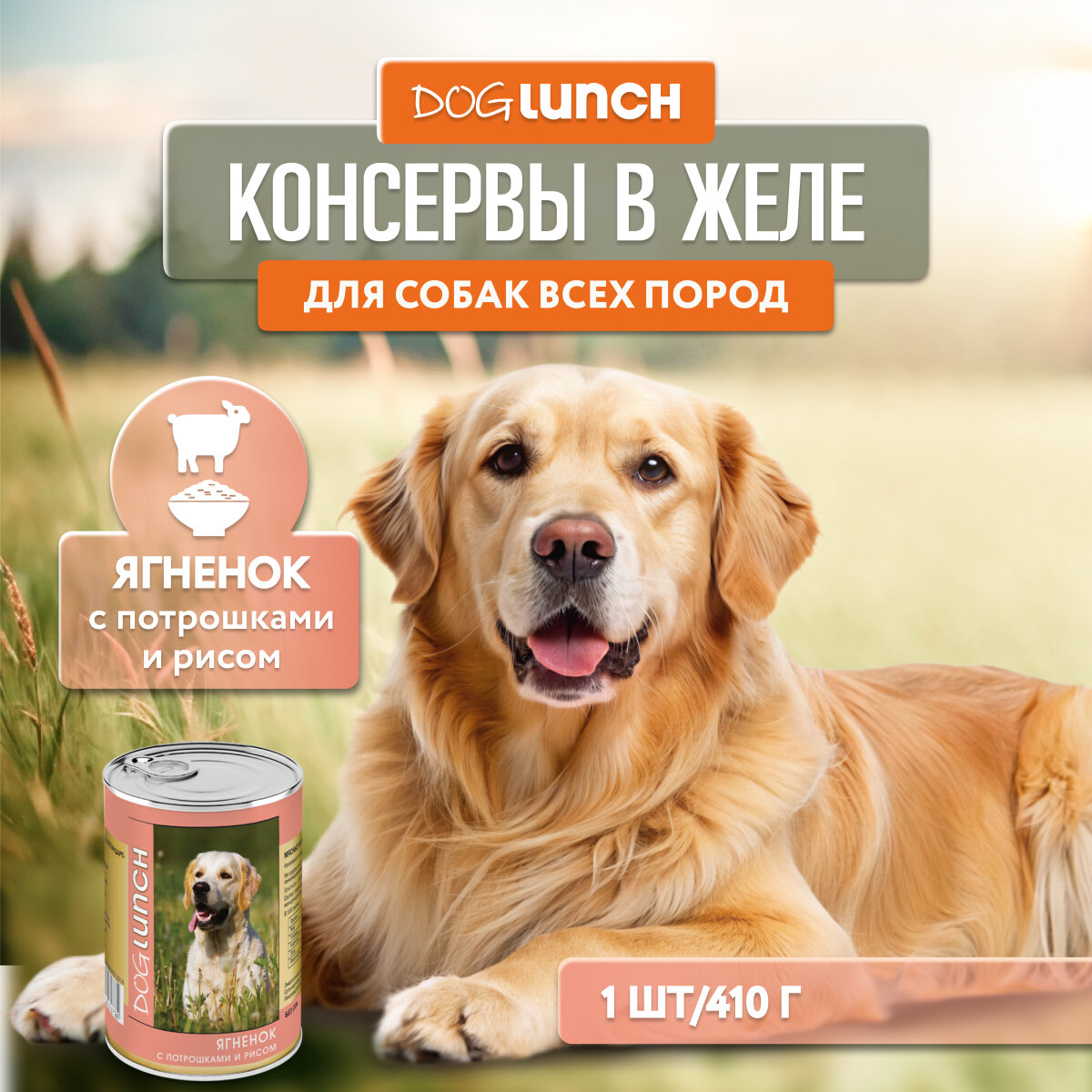 Dog Lunch консервы для собак Ягненок с потрошками и рисом в желе 410г х1шт 222 ₽