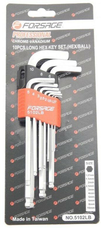 FORSAGE F5102LB Набор кючей Г-образных динных с шаром, 10 пр: 6 гр, 1.27, 1.5, 2, 2.5, 3-6, 8, 10 мм, в пастиково