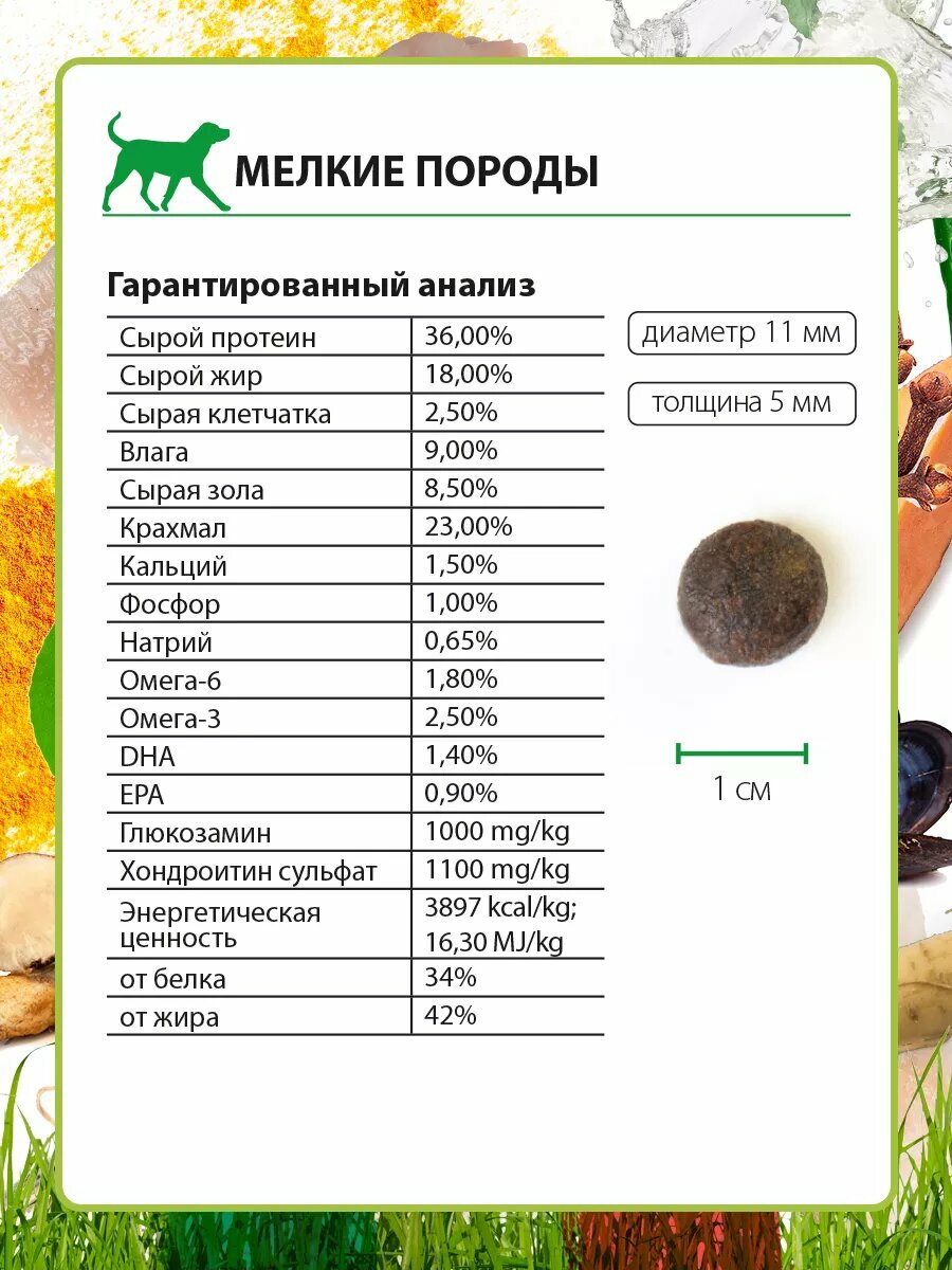 | Состав | дегидратированная курица (40%), свежая курица без костей (20%), дегидратированная утка (10%), батат, куриный жир, гороховый крахмал, рыбий жир, волокна гороха, куриная печень, корень цикория (источник инулина и ФОС), подорожник, инактивированные сухие пивные дрожжи (источник МОС), куриные хрящи (источник глюкозамина и хондроитина), карбонат калия, Алое вера (0,10%), корень женьшеня (Panaxginseng) (0,10%), розмарин лекарственный, куркума длинная, гвоздика, лимон (Rosmarinusofficinalis, Curcumalonga, Eugeniacaryophyllus, Citrussp.) - (0,05%), сок юкки |