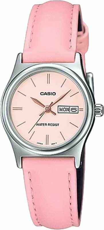 LTP-V006L-4B Casio наручные часы кварцевые WR30 (3 атм) женские серебряный, розовый отображение дня недели, отображение числа минеральное стекло