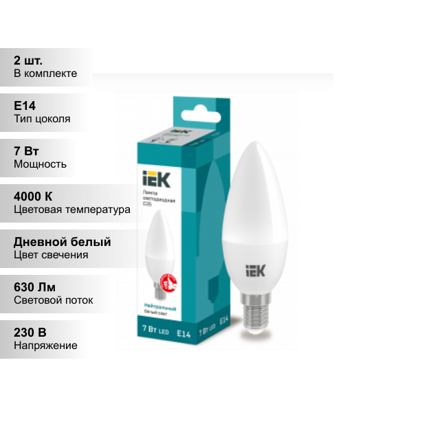 (2 шт.) Светодиодная лампочка IEK C35 7Вт 230В 4000К E14 информация: