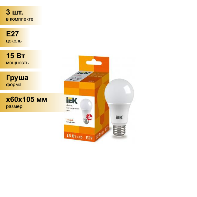 Отзывы на (3 шт.) Светодиодная лампочка IEK ЛОН A60 E27 15W(1350lm) 3000K 2K 116x60 ECO LLE-A60-15-230-30-E27 . Цоколь E27