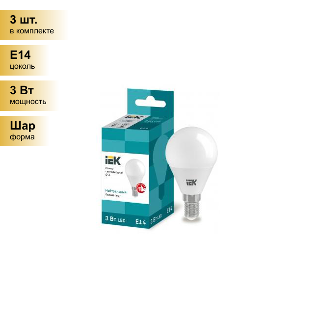 (3 шт.) Светодиодная лампочка IEK шар G45 E14 3W(210lm) 4000K 4K 78x45 матов. ECO LLE-G45-3-230-40-E14 . Цоколь E14 информация: