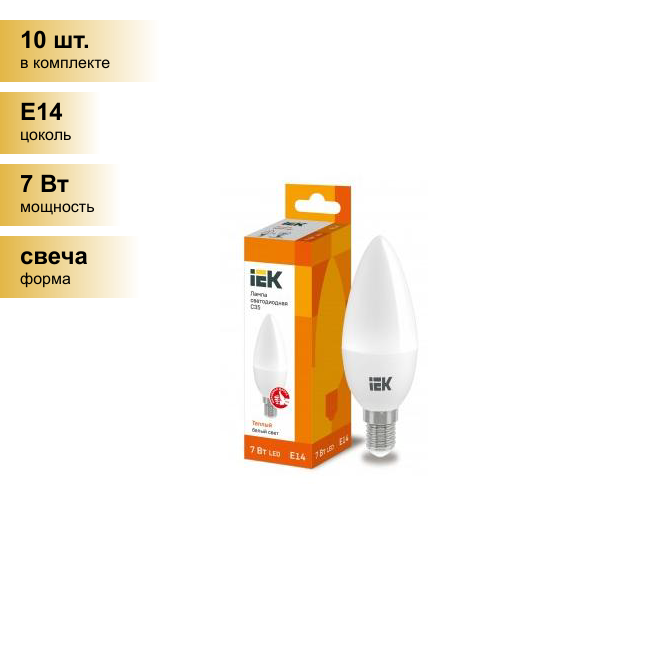 10 цен на Светодиодная LED лампа IEK свеча C35 E14 7W(630lm) 3000K 2K 100x35 матовая ECO LLE-C35-7-230-30-E14 (упаковка 10 штук)