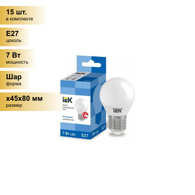 (15 шт.) Светодиодная лампочка IEK шар G45 E27 7W(630lm) 6500К 6K 83х45 матов. ECO LLE-G45-7-230-65-E27 . Цоколь E27 информация:
