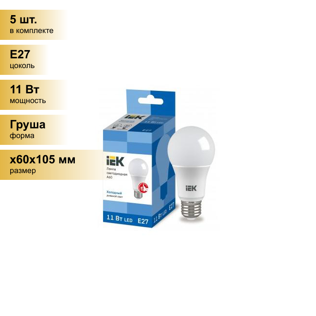 Отзывы на (5 шт.) Светодиодная лампочка IEK ЛОН A60 E27 11W(990lm) 6500К 6K 110х60 матов. ECO LLE-A60-11-230-65-E27 . Цоколь E27